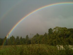 昨日はそんな片付けをしている時に、急にサーっと雨が降ってきて、これは虹が出そう。と思って振り向いたらやっぱり大きくくっきりと虹が出ていました。