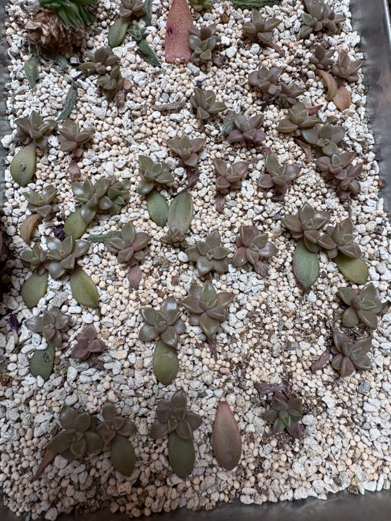 家のリビングに、バットに敷き詰められた多肉の葉。